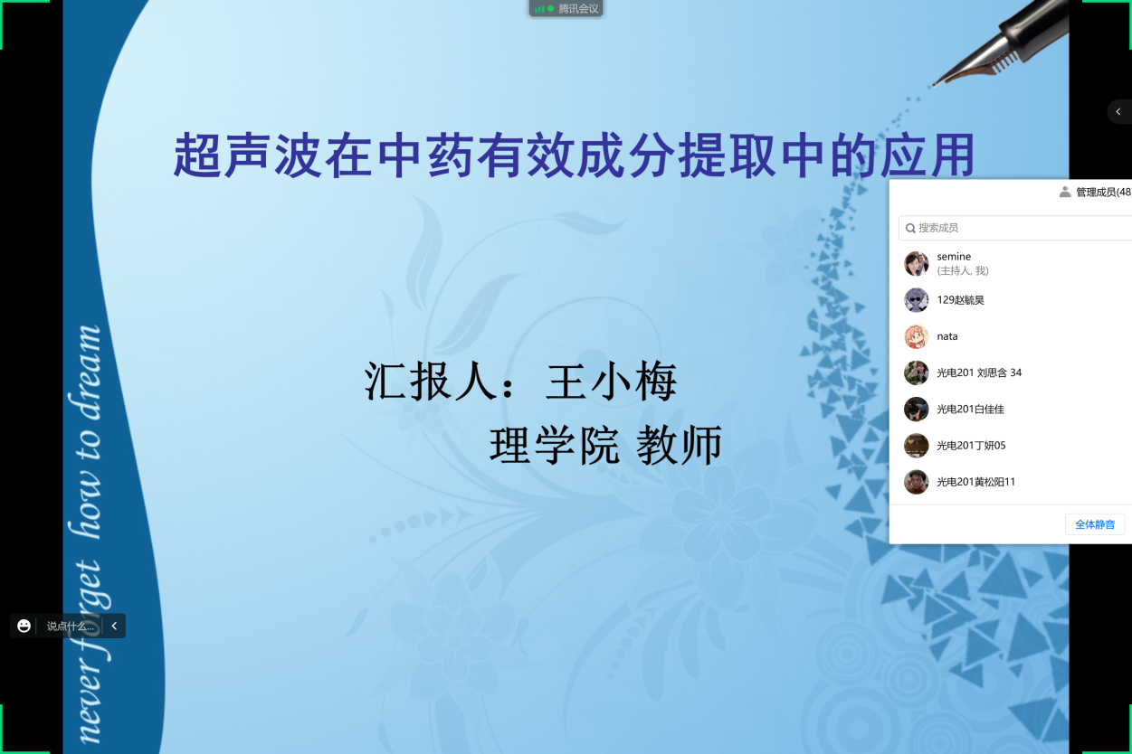2022年9月17日,m88在腾讯会议线上举办了“超声波在中药有效成分提取中的应用”学术讲座,此次讲座由物理教研室主任王小梅主讲。
