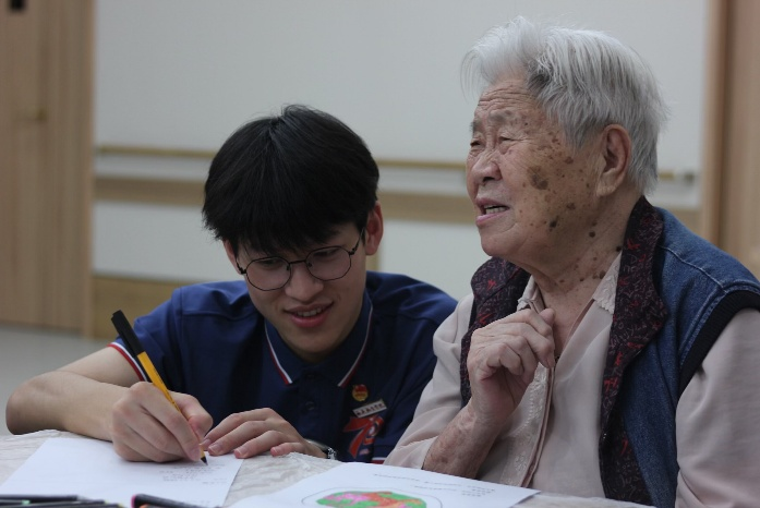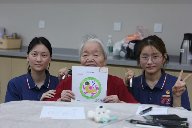 曼陀罗绘画,是活动最美的章节。实践队员们化身贴心助手,为视力模糊的长者递上放大镜,助行动不便的老人稳定画笔,悄然间添补缤纷颜料。他们俯身倾听,轻声询问:“爷爷,您想涂什么颜色?”“奶奶,这个图案搭配真好看!”平凡的画笔在长者们手中,流淌出不平凡的热爱——褶皱的手握着蜡笔,笔尖下流泻出阳光的暖色、天空的澄澈……每一幅独一无二的作品,都是此刻心绪的无声绽放,见证着专注的宁静与创作的喜悦