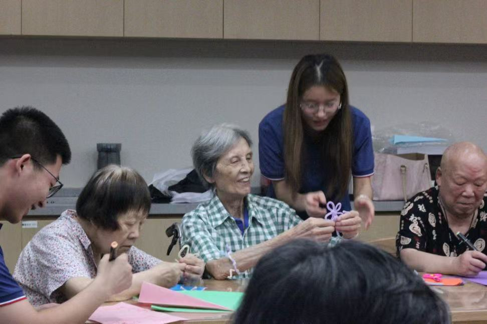 当蛋糕的甜香渐渐散去,活动的喧嚣也归于平静。年轻志愿者开始收拾散落的彩纸和用完的纸盘。也许,真正在房间里留下的,不只是桌上那些色彩斑斓的手工花束,不只是片刻的歌声悠扬与蛋糕甜香。是在手指碰触传递扭扭棒的温度里,是在老人脱口而出对往昔岁月的慨叹里,更在陈爷爷那只紧握着“孙辈”的手心里——一种无需言明的亲密,一种短暂交汇却足以对抗日常孤寂的暖流,已悄然注入彼此的心底。青春的关怀与“夕阳”的笑容短暂交汇,留下了一道温暖的光痕,无声地诉说着陪伴之于生命的分量。(文/光电信息231 吕泓帆 图/光电信息234 陈思雨 初审/学工办 曾妍 终审/胡红亮)