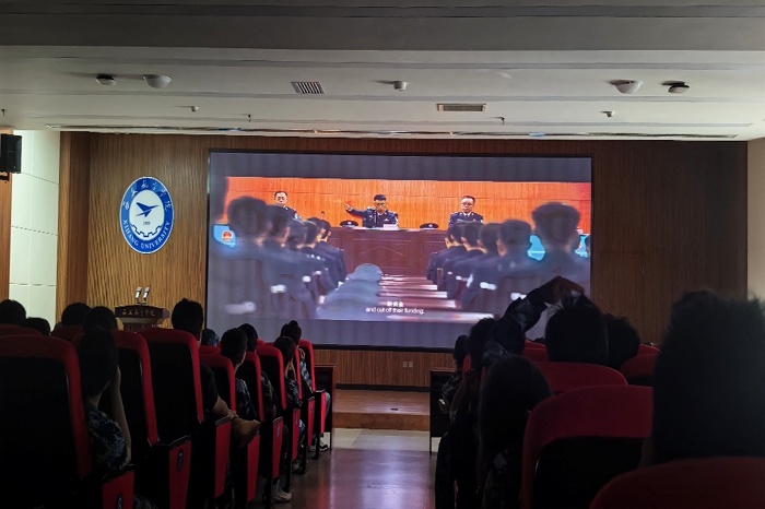 学院精选经典红色影视作品,通过震撼的镜头语言与深刻的历史叙事,带领新生重温峥嵘岁月。观影过程中,现场氛围庄重而专注,新生们时而为革命先辈的英勇无畏屏息凝神,时而为民族命运的艰难转折心潮澎湃,不少同学眼中泛起泪光。当看到志愿军战士在极寒环境中坚守阵地、革命先烈为理想信念慷慨赴死的场景时,大家深刻体会到如今幸福生活的来之不易,也对“家国”二字有了更厚重的理解。