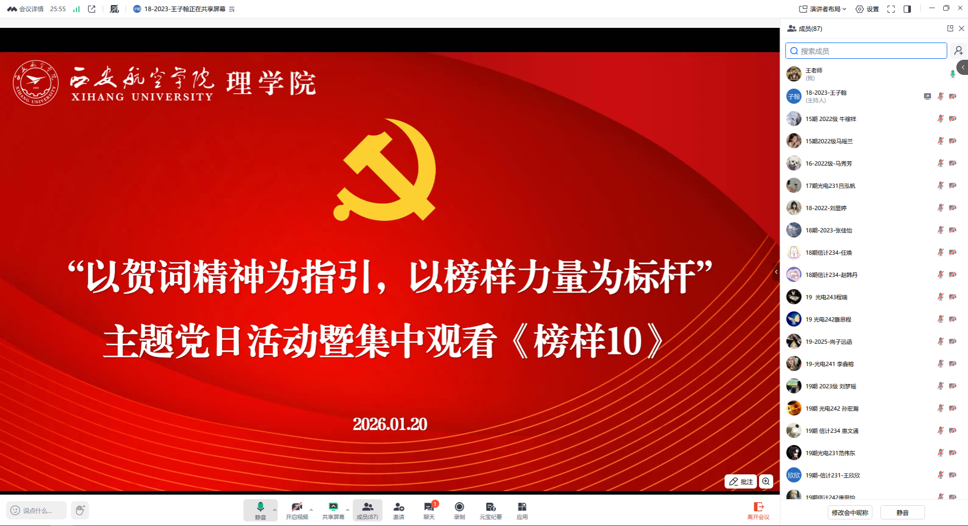 在交流讨论环节,与会党员结合自身学习生活实际,踊跃分享感悟与思考。光电专业学生党员沈惠瀛表示:“一位位榜样人物就像一面面旗帜,他们扎根基层、服务人民的行动,让我更加明确了党员的责任。作为理科生,我们要以他们为标杆,将个人理想融入国家发展,夯实专业基础,积极投身学科竞赛。”信计专业预备党员王子翰说道:“贺词精神鼓舞人心,榜样事迹催人奋进。这次活动是一次深刻的思想洗礼,激励我未来无论从事理论研究还是软件开发,都要坚守初心,服务社会。”另一位学生党员马瑶兰谈到:“《榜样10》中那些在平凡岗位上默默奉献的党员,诠释了什么叫做‘平常时候看得出来、关键时刻站得出来、危急关头豁得出来’,这激励我在日常也要时刻以党员标准要求自己,发挥先锋模范作用。”